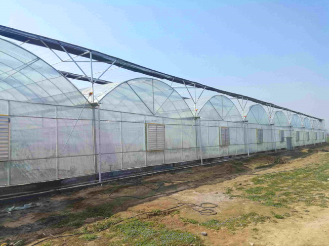 4、采用吸湿性良好的保温幕材料。透湿和吸湿性良好的保温幕材料,如无纺布能够阻止棚内表面结露,并可防止露水落到植株上,从而降低连栋温室空气湿度。