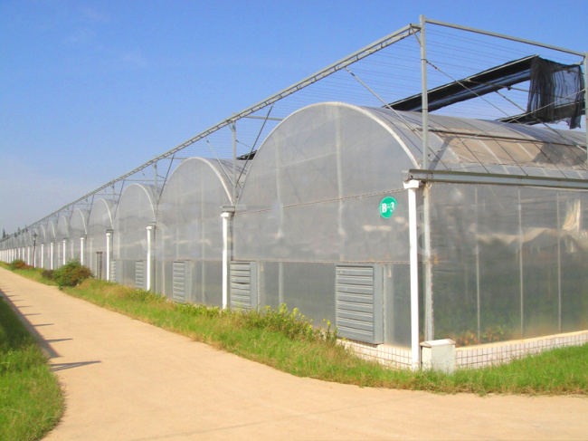 4、采用吸湿性良好的保温幕材料。透湿和吸湿性良好的保温幕材料,如无纺布能够阻止棚内表面结露,并可防止露水落到植株上,从而降低连栋温室空气湿度。